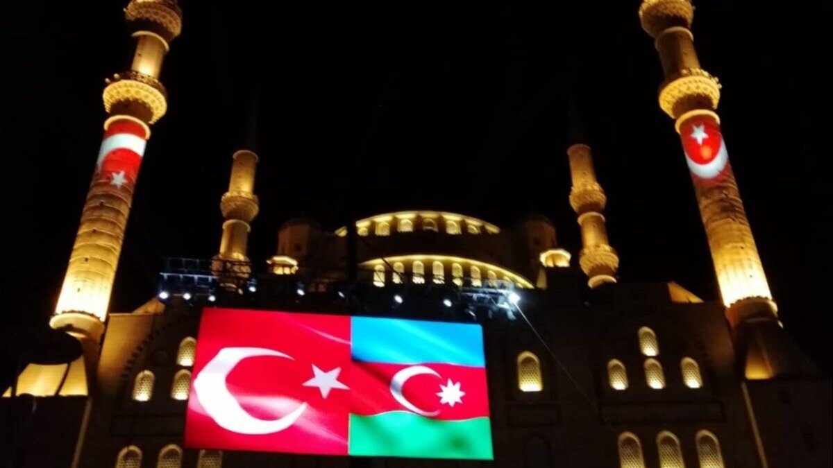 Türkiye’nin en büyük camilerinden Abdulhamithan’da, Türk ve Azerbaycan bayrakları ışıklandırma sitemiyle dalgalandırıldı.
