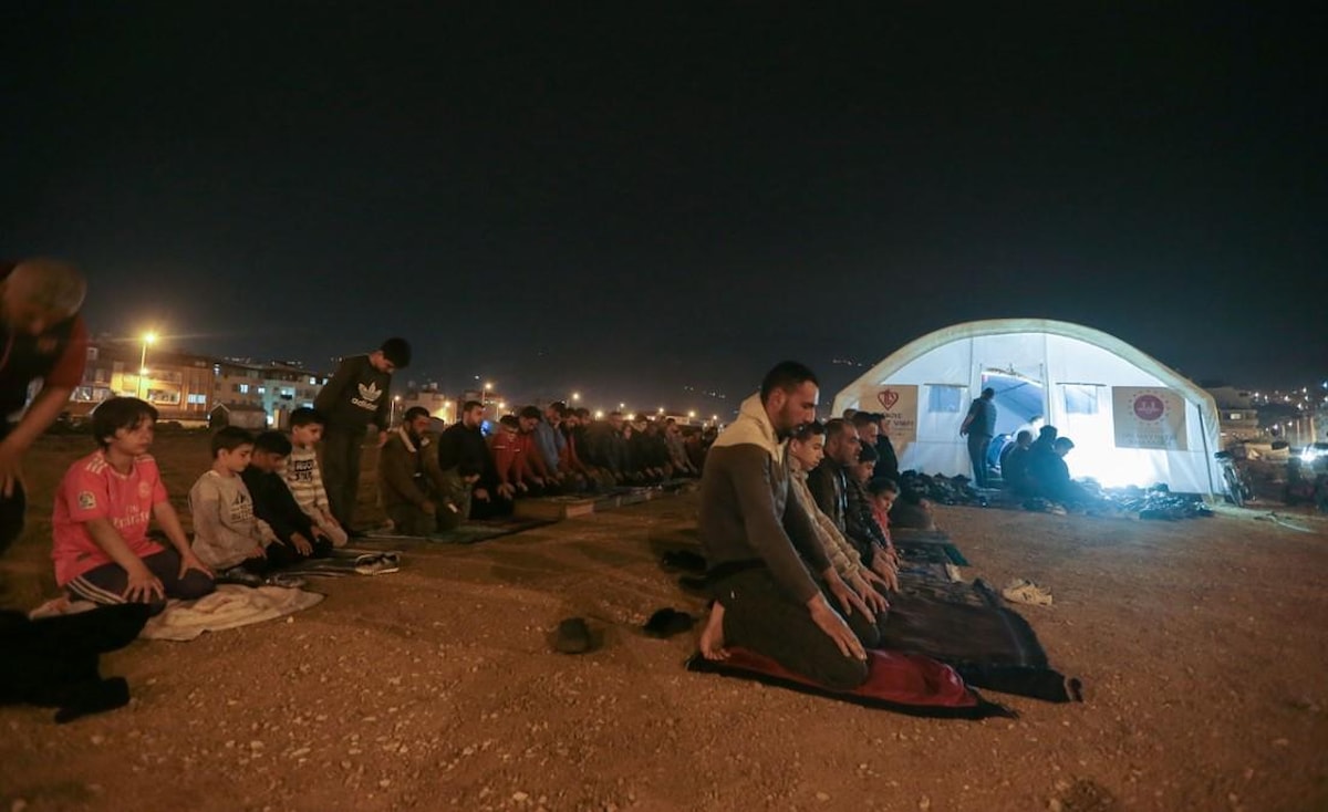Büyük yıkımın yaşandığı illerden biri olan Hatay'da depremzedeler, ilk teravih namazını kıldı.