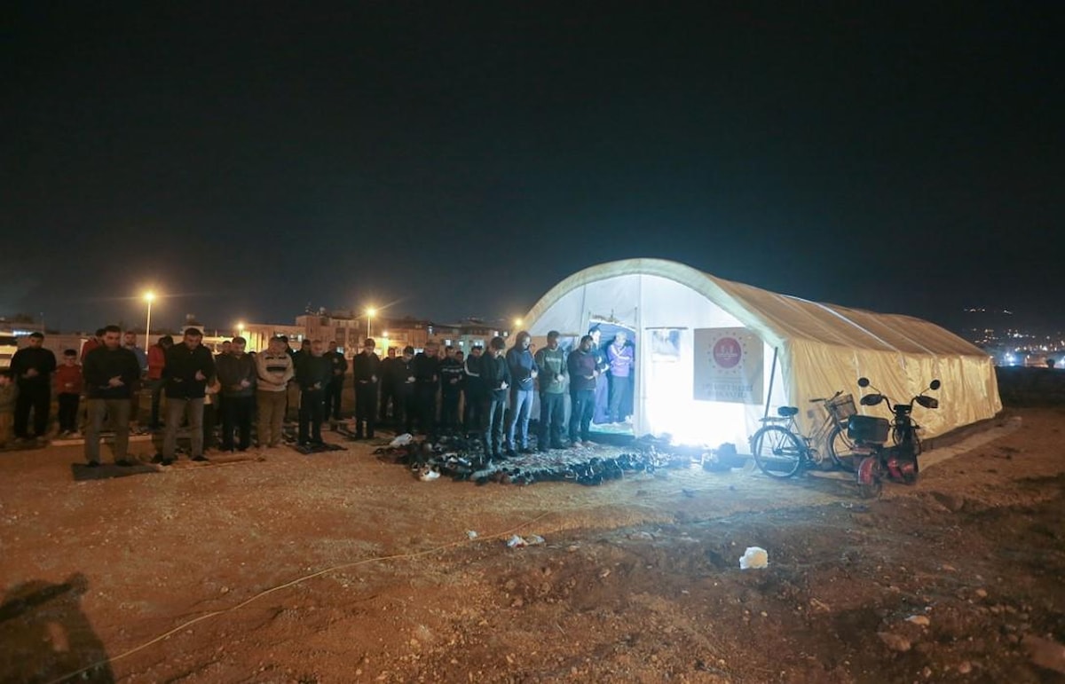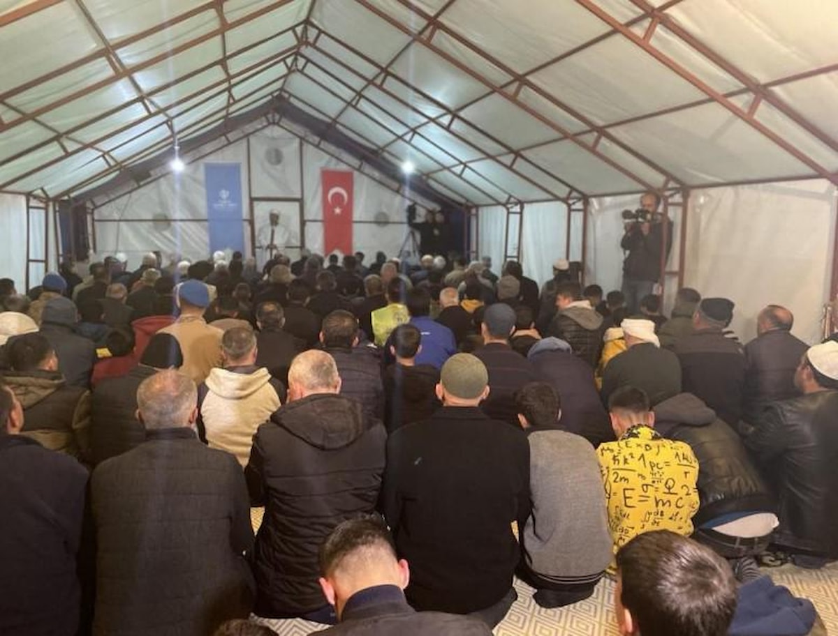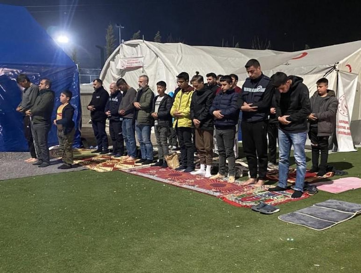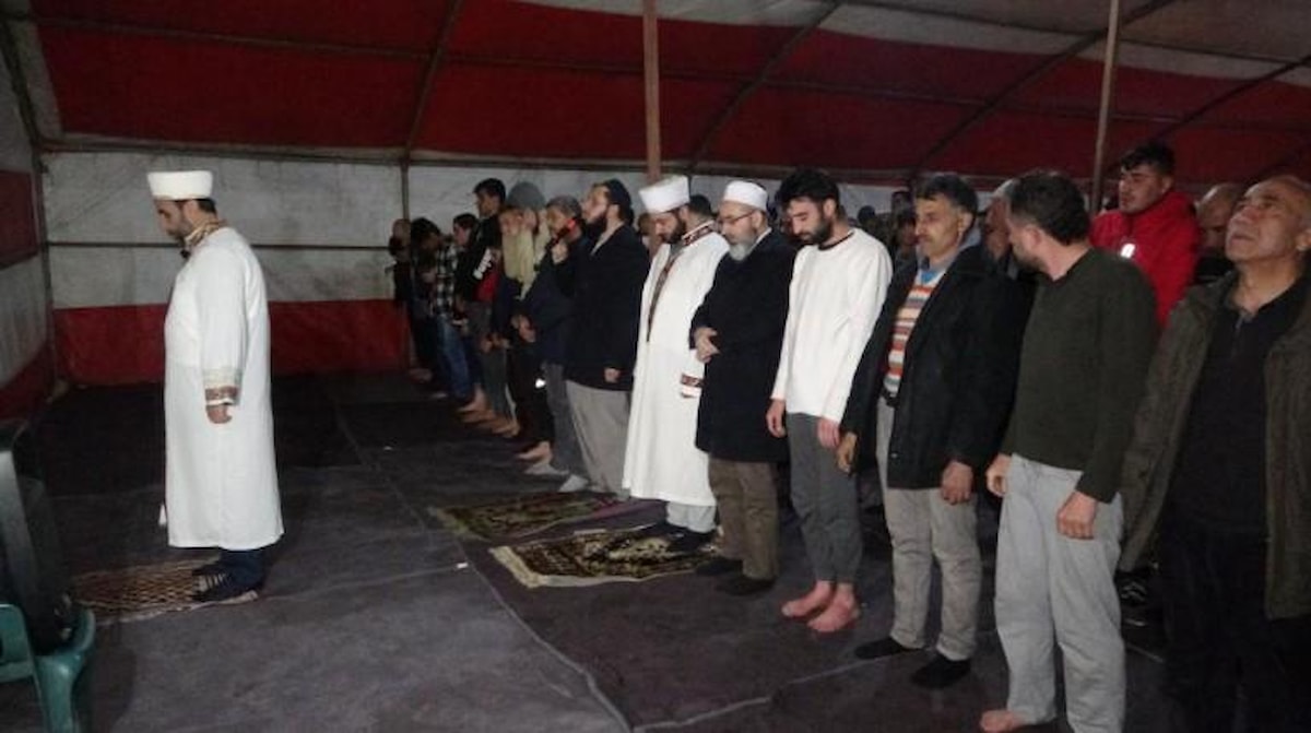 Malatya’da kentin muhtelif noktalarında İl Müftülüğü tarafından oluşturulan çadırlarda ilk teravih namazı kılınırken, okunan Kur’an-ı Kerim ardından eller semaya açılarak depremde hayatını kaybedenler için dualar edildi.