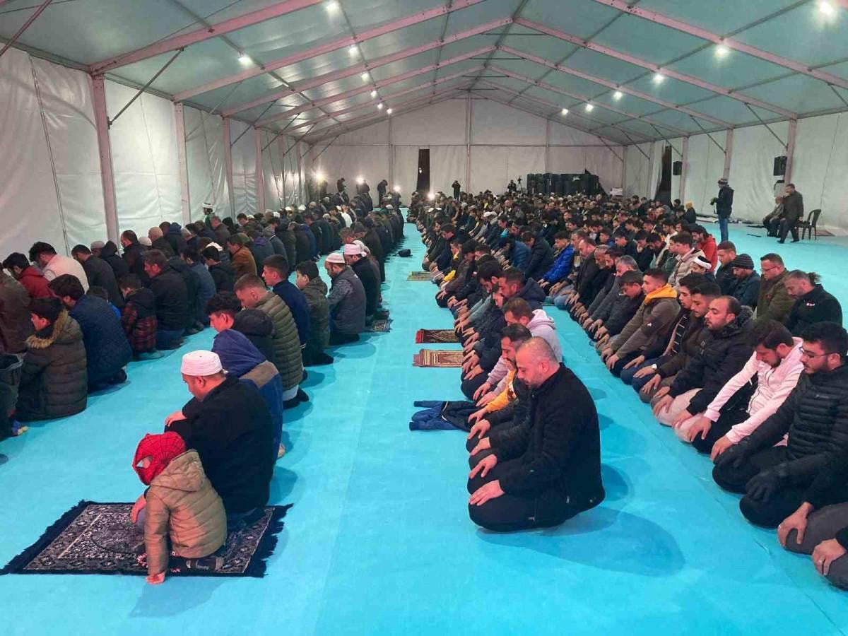 Vatandaşlar İskenderun ilçesinde kurulan çadır mescitte namazlarını kıldı.