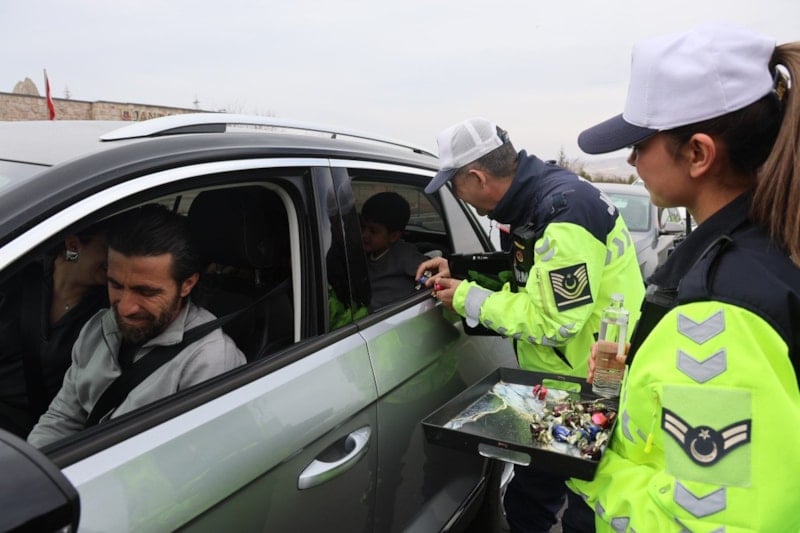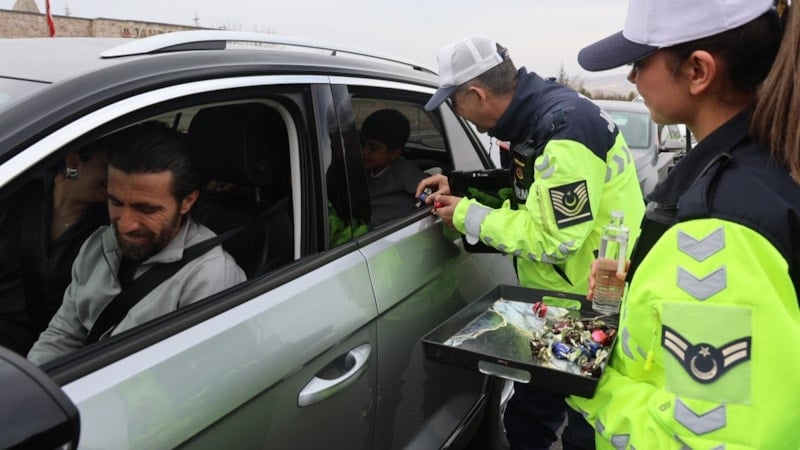 Niğde'nin Avanos ilçesine bağlı Çavuşin köyündeki jandarma uygulama noktasında, bayram tatili için bölgeyi ziyaret eden sürücüler ve turistler hem güvenlik kontrollerine tabi tutuldu hem de sürpriz bir karşılama ile karşılaştı.