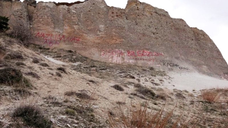 Kayseri'nin Yeşilhisar ilçesinde bulunan ve sayıları yaklaşık 40’ı bulan peribacası benzeri doğal oluşumlar, sprey boyayla yazılan yazılar nedeniyle tahrip oldu.