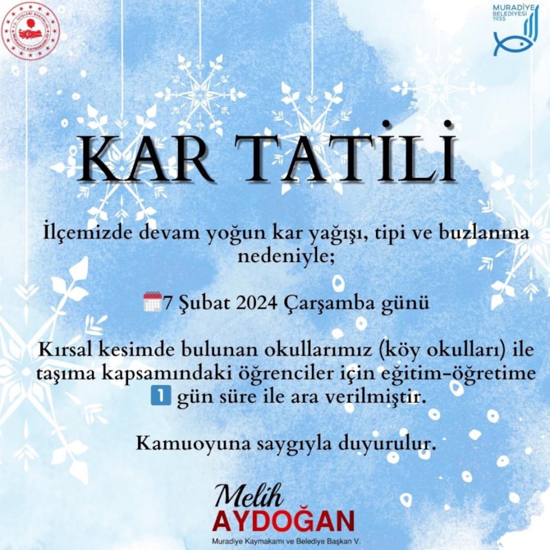 "İlçemizde devam eden yoğun tipi ve meydana gelebilecek buzlanma olayları nedeniyle 7 Şubat 2024 Çarşamba günü köy okulları ve taşımalı eğitim çerçevesindeki tüm okullarımızda eğitim-öğretime 1 gün süre ile ara verilmiştir. Kamuoyuna saygıyla duyurulur."