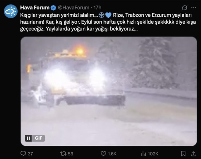Paylaşımında, “Kışçılar yavaştan yerimizi alalım... Rize, Trabzon ve Erzurum yaylaları hazırlanın! Kar, kış geliyor. Eylül son hafta çok hızlı şekilde şakkkkk diye kışa geçeceğiz. Yaylalarda yoğun kar yağışı bekliyoruz…” ifadelerine yer verdi.