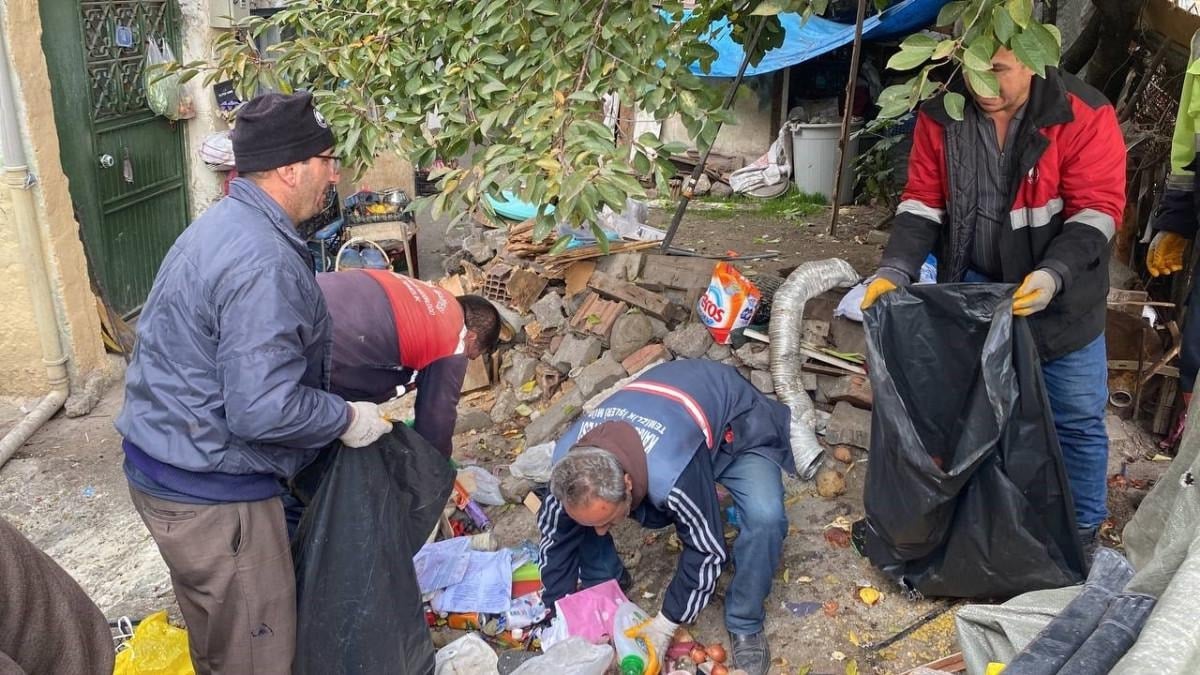 Yaklaşık iki saatlik çalışmanın ardından evin içinden ve bahçesinden çıkan çöpler temizlenirken, ev ve bahçe dezenfekte edildi.
