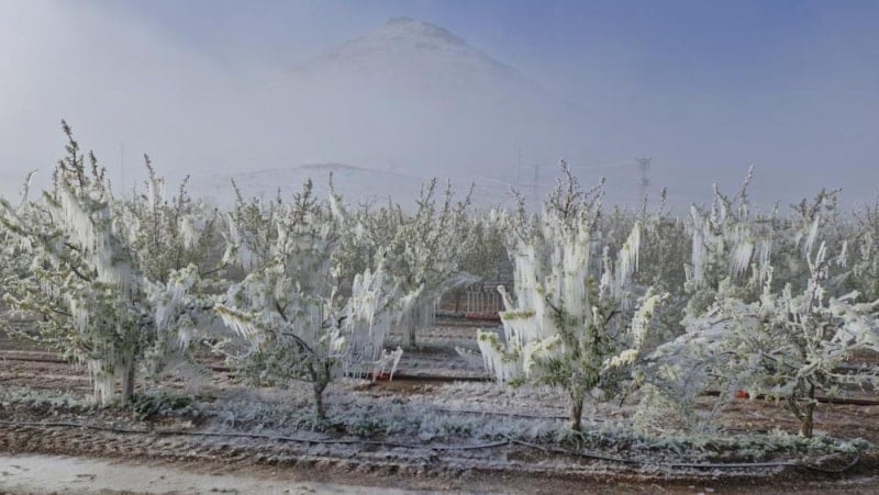 Karaman'da çiçek açan milyonlarca elma ağacını don vurdu. Dona karşı sulama yapılan bahçelerdeki elma ağaçlarının tamamen buz tutması adete buzulları hatırlattı.