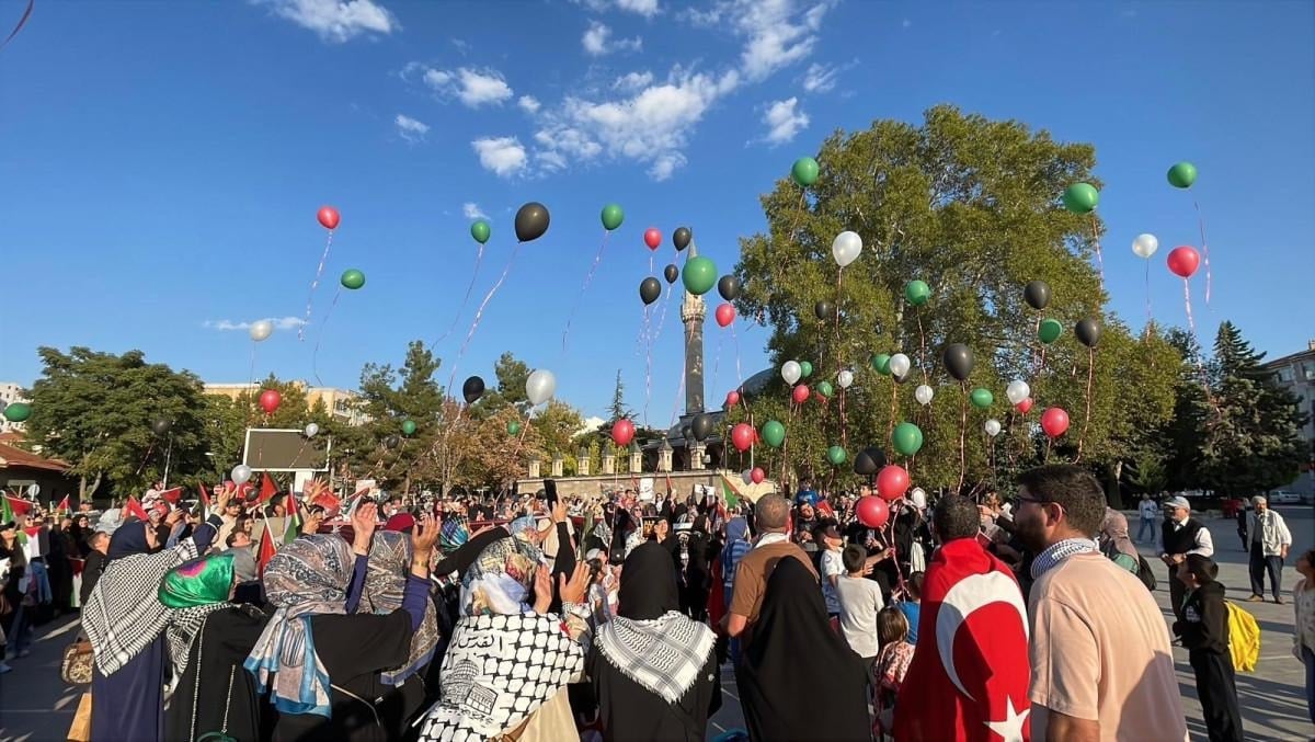 Aktekke 15 Temmuz Demokrasi Meydanı'nda son bulan yürüyüşün ardında kalabalık hep birlikte İstiklal Marşı'nı okuyarak ellerindeki balonları Filistin'in özgürlüğü için gökyüzüne bıraktı.