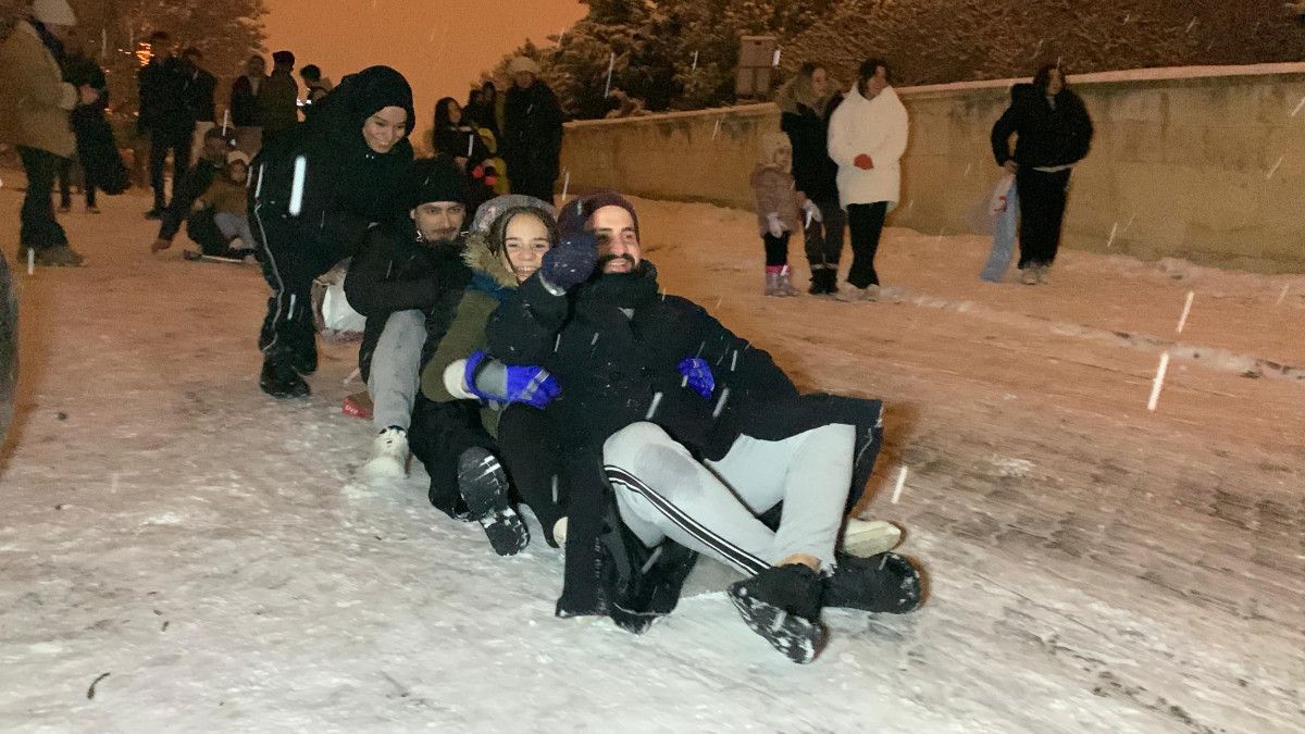Karın tadını çıkarmak isteyen vatandaşlar ise evlerinden getirdikleri poşetler ve sinilerle ailecek Karaman Kalesi’ne akın etti.