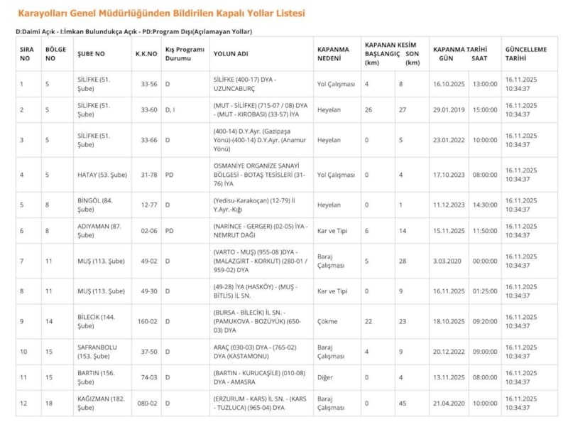 Karayolları Genel Müdürlüğü'nün yol durumu bültenine göre son durum şöyle: