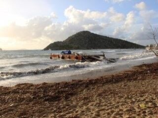 Bugün öğlen saatlerinde Gümüşlük sahiline gelen deniz aracı, iş makinelerini adaya taşımak için koya yanaştı.