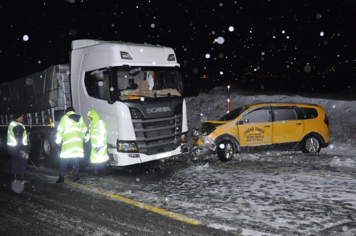 Kars'ta kar yağışının sürdüğü Kağızman ilçesine bağlı bağlı Paslı Geçidinde Veysel Taş yönetimindeki 25 ABG 902 plakalı tır ile Mehmet Salman idaresindeki 76 T 0032 plakalı ticari taksi çarpıştı.
