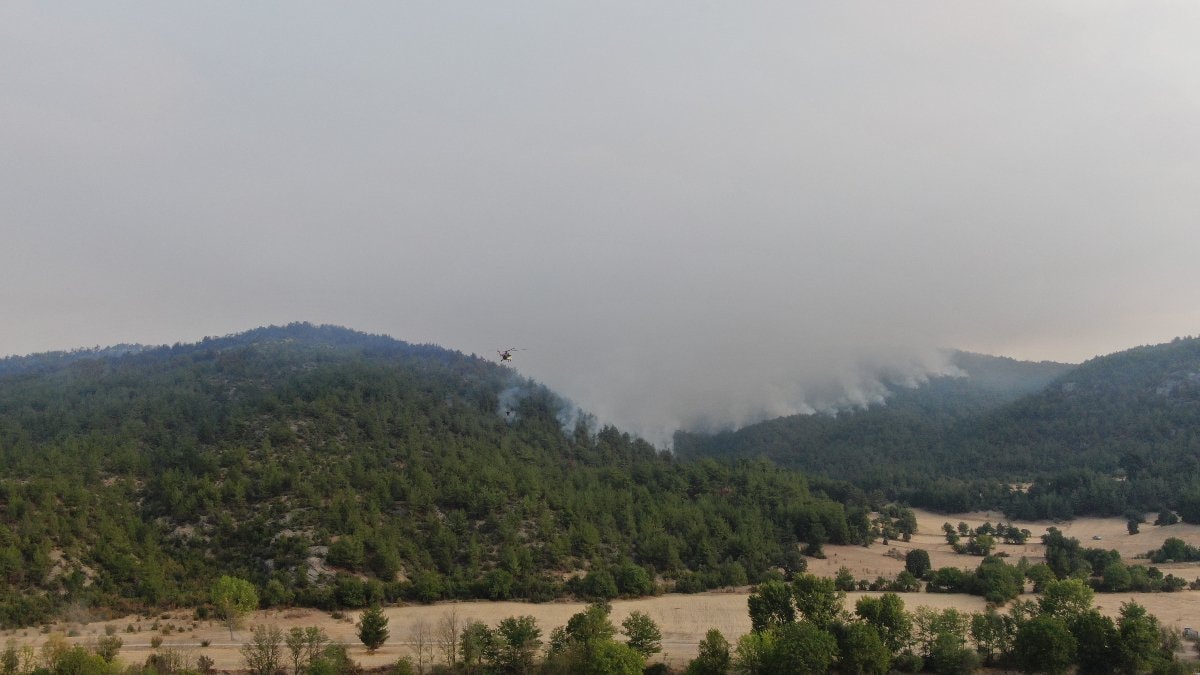 Bölgedeki ekipler, yangına çok sayıda arazöz ve helikopterle müdahale ediyor.