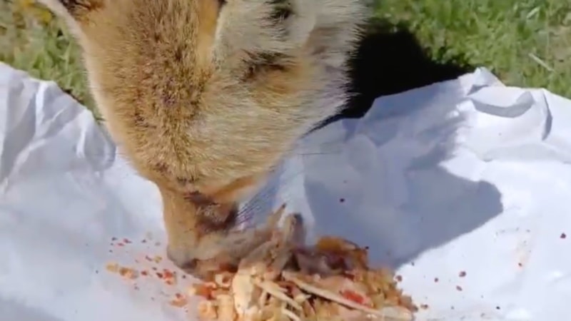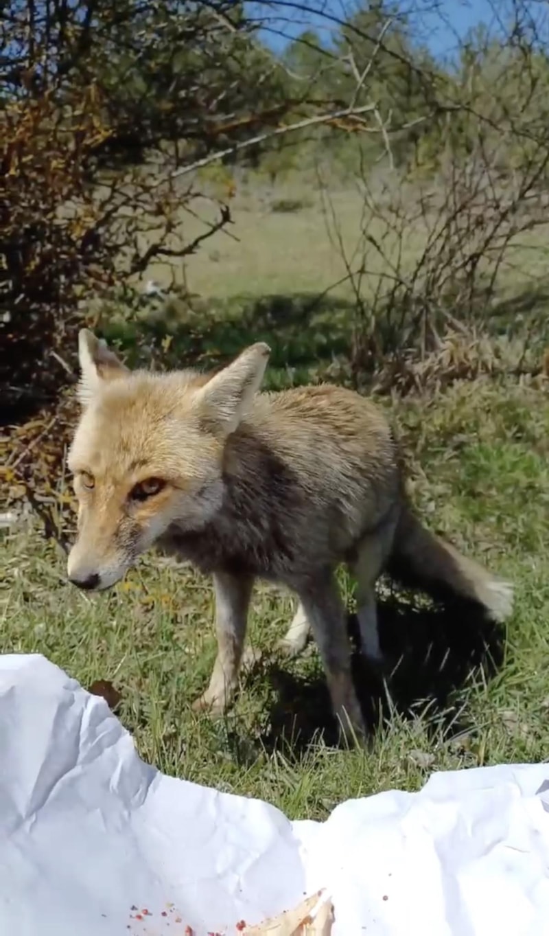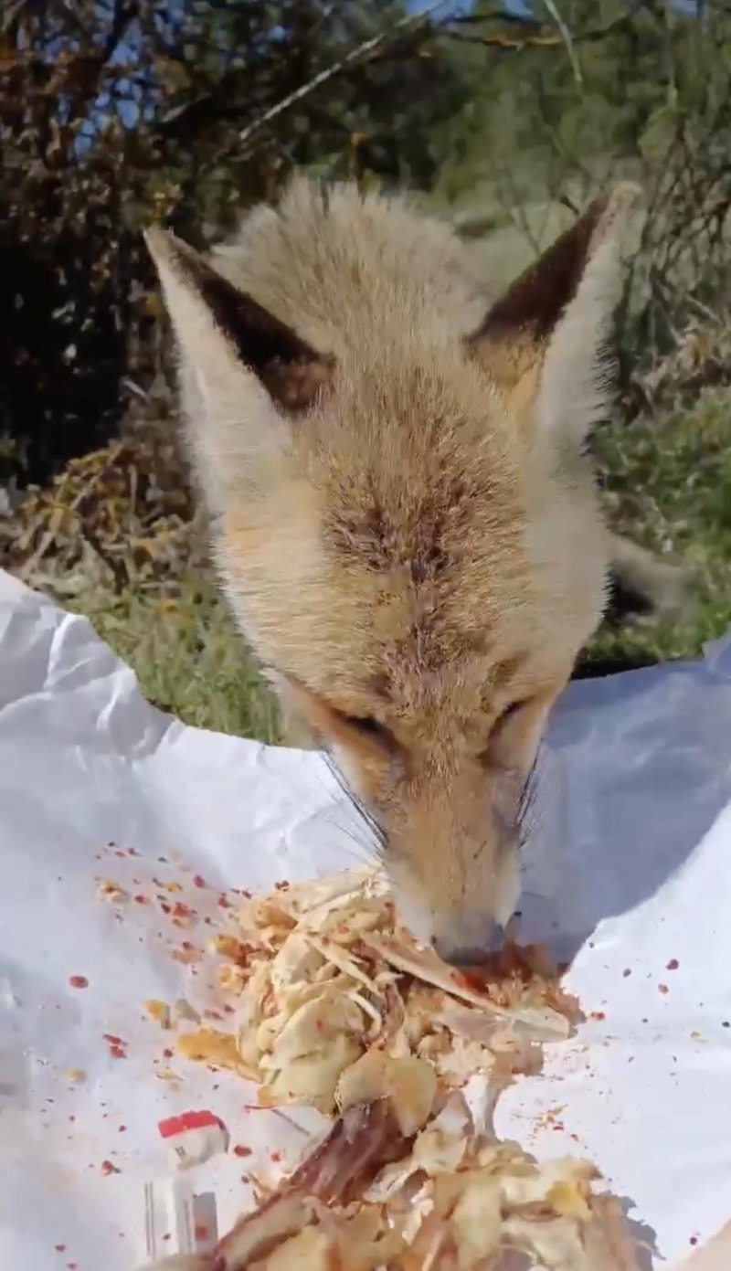 Vatandaşlar yanlarına gelen tilkiyi, tavuk etiyle besledi. Verilen tavuk etinden yiyen tilki bir süre sonra uzaklaştı.