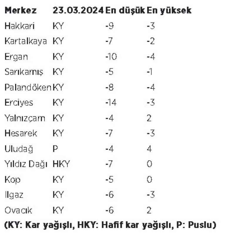 Meteoroloji Genel Müdürlüğü verilerinden derlenen bilgilere göre, kayak merkezlerindeki kar kalınlığı Hakkari'de 246, Palandöken'de 217, Sarıkamış ve Kartalkaya'da 154, Ergan'da 151, Erciyes'te 80, Yalnızçam'da 64, Hesarek'te 59, Uludağ'da 58, Ilgaz'da 47, Zigana'da 40, Yıldız Dağı'nda 30, Kop'ta 29, Çambaşı'nda 22, Ovacık'ta 18, Yıldıztepe ve Davraz'da 15, Kartepe'de 14, Keltepe'de 10, Elmadağ'da 6, Yedikuyular ve Mersivan'da 5 santimetre ölçüldü.