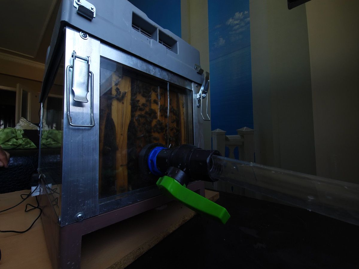 Dışarının ısısını takip ediyorum ve ısı düşecekse vanayı kapatıyorum ama kovanı güneş görmeyen yere götürürüm. Arı salkımda rahatça duruyor. Dışarı ısısı artınca buraya getirip vanasını açıyorum ve arı normal hayatına devam eder. Ben burada bal üretmekten ziyade araştırma için bunu yaptım. Şuan içerisinde de balı var. 5 çıtanın 4’ü yavru, 1’i ful bal dolu. Arılar kenar duvara stok yapar. İstesem oradaki 3-4 kilo balı alabilirim." diye konuştu.