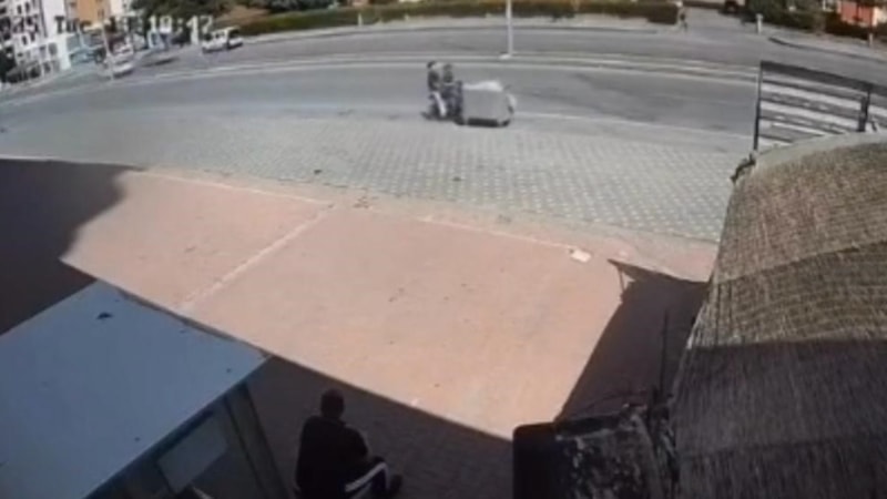Kayseri’nin Melikgazi ilçesinde elektrikli scooter ile ilerleyen 2 kişi, yol kenarında duran çöp konteynerine çarptı. Güvenlik kamerasına yansıyan kaza, görenleri güldürdü.
