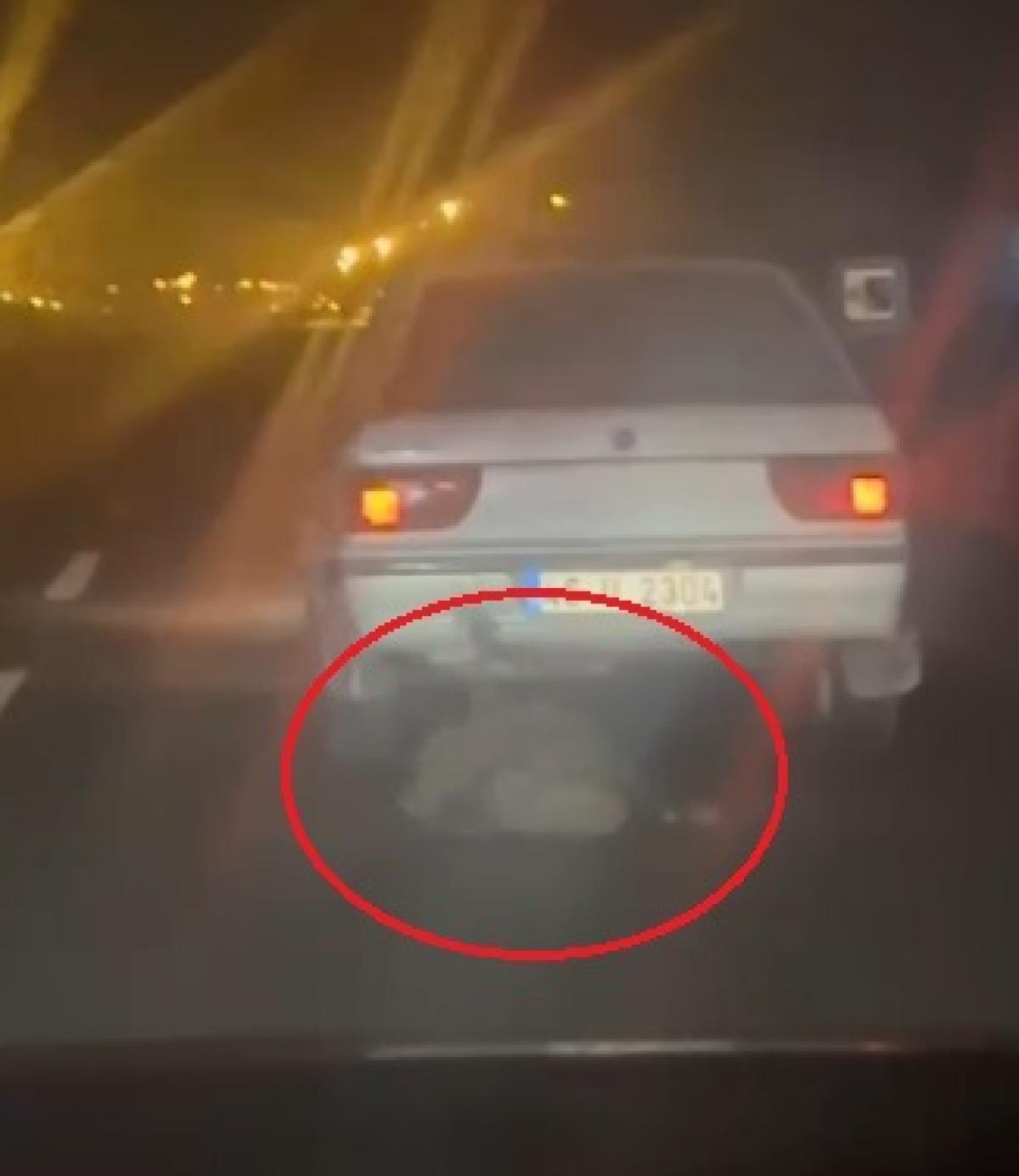 Kayseri-Malatya yolunda bir kişi, iddiaya göre avladığı domuzu otomobilinin arkasına bağlayarak metrelerce ilerledi.