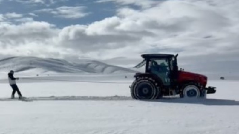 Pınarbaşı ilçesi İnliören köyünde hayvancılık ile uğraşan Ramazan Gök, traktörün arkasına bağladığı snowboard ile karın keyfini doyasıya yaşadı.