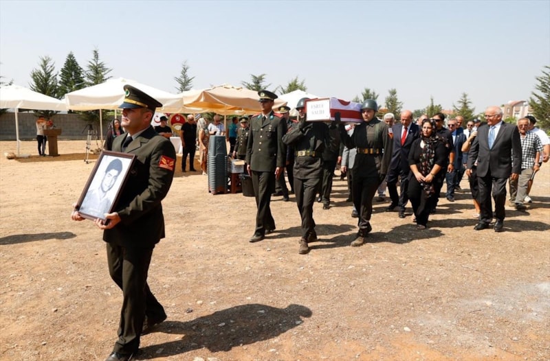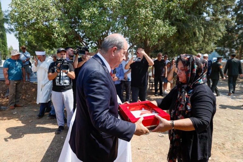 Şehit Eşref Salih'in tabutunun üzerindeki Türk ve KKTC bayrakları, Cumhurbaşkanı Ersin Tatar tarafından şehidin yakınlarına teslim edildi.