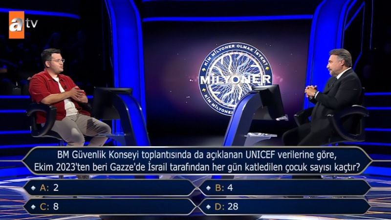 Kim Milyoner Olmak İster yarışmasında, UNICEF verilerine göre Ekim 2023’ten bu yana Gazze’de İsrail saldırılarında her gün hayatını kaybeden çocuk sayısının yer aldığı soru yarışmacıya yöneltildi.