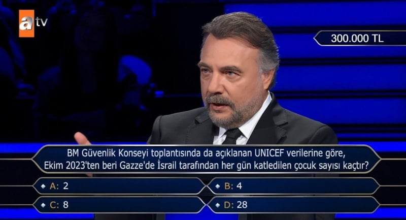 300 bin TL'lik soruya ulaşan yarışmacıya, “BM Güvenlik Konseyi toplantısında da açıklanan UNICEF verilerine göre, Ekim 2023’ten beri Gazze’de İsrail tarafından her gün katledilen çocuk sayısı kaçtır?” sorusu yöneltildi.