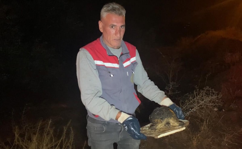 Çalışmalar sırasında sel sularına kapılmak üzere olan bir kaplumbağa ekipler tarafından kurtarılarak güvenli bölgeye bırakıldı.