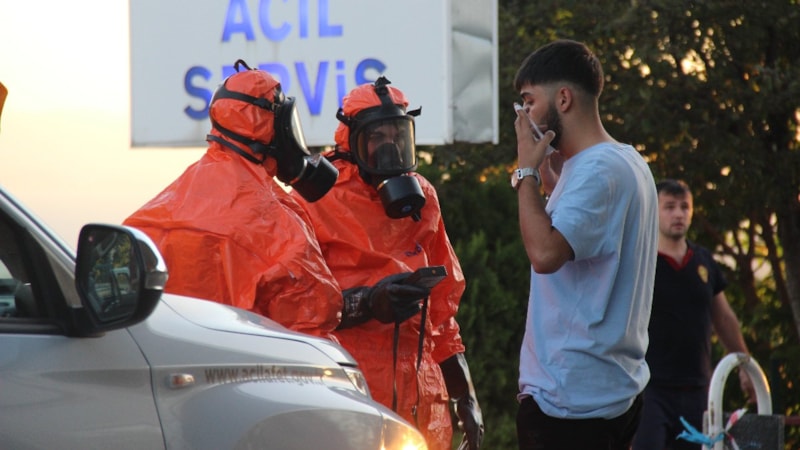 Özel giysili itfaiye ekipleri, hastaneden çıkartılan kişilere kimyasal reaksiyon testi uyguladı.