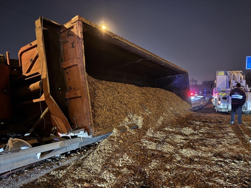 Kocaeli’nin Başiskele ilçesinde yonga taşıyan bir tır virajı alamayarak devrildi.