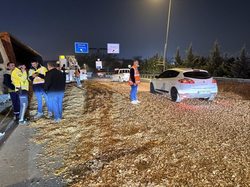 Karayolları ekipleri, yola saçılan yongaları temizlemek için çalışma başlattı.