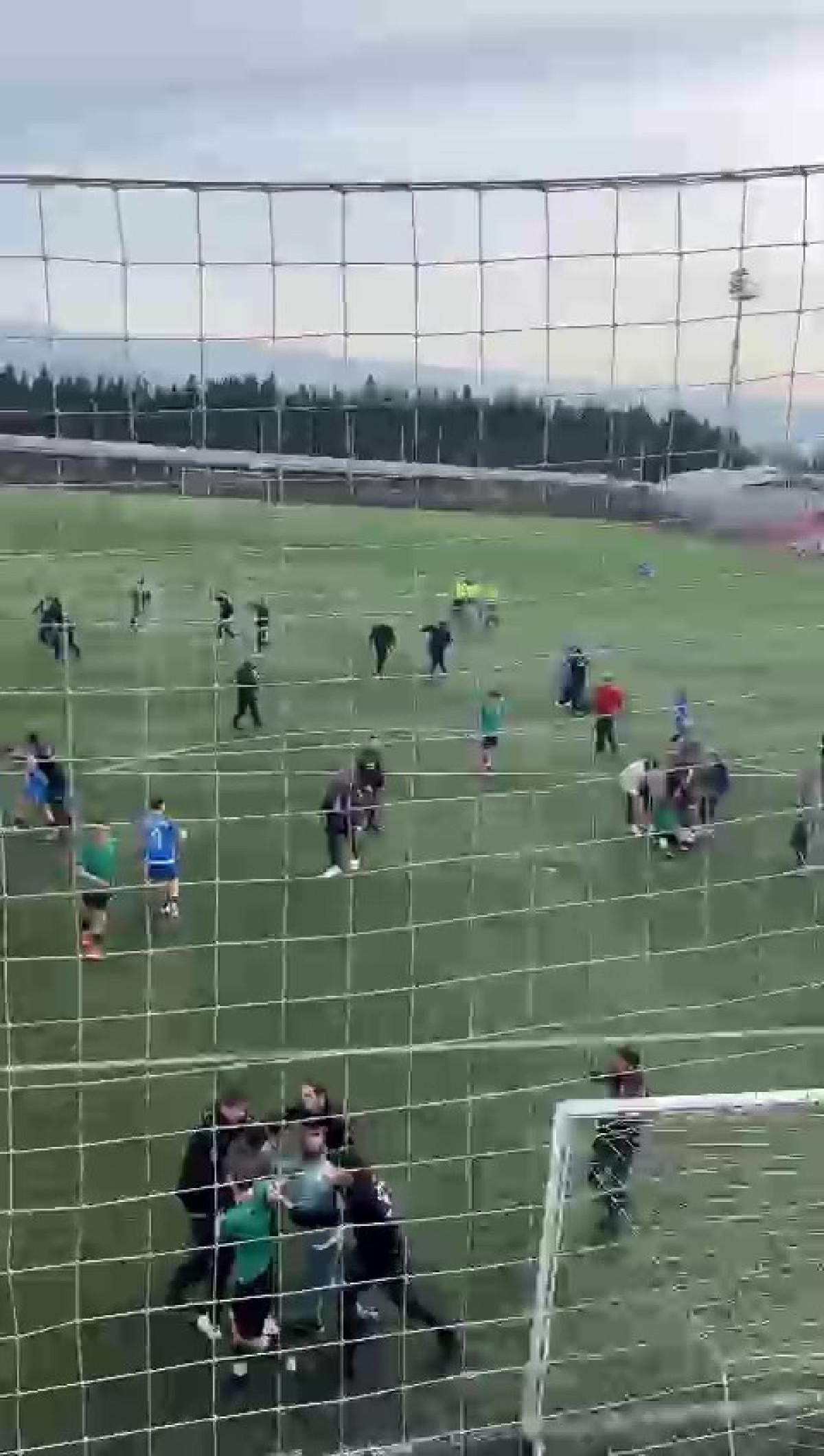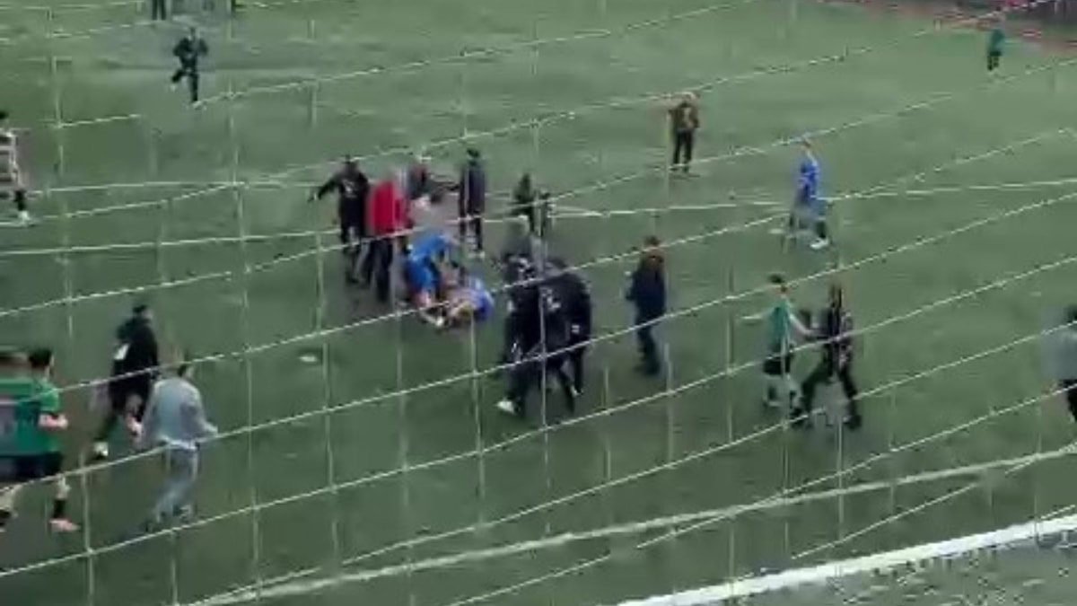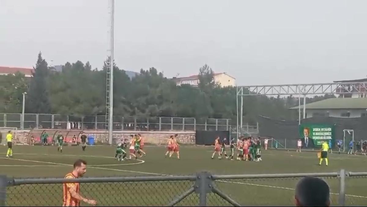Futbolcular arasında küfür sebebiyle sahada yaşanan kavgaya taraftarlarda müdahil oldu.