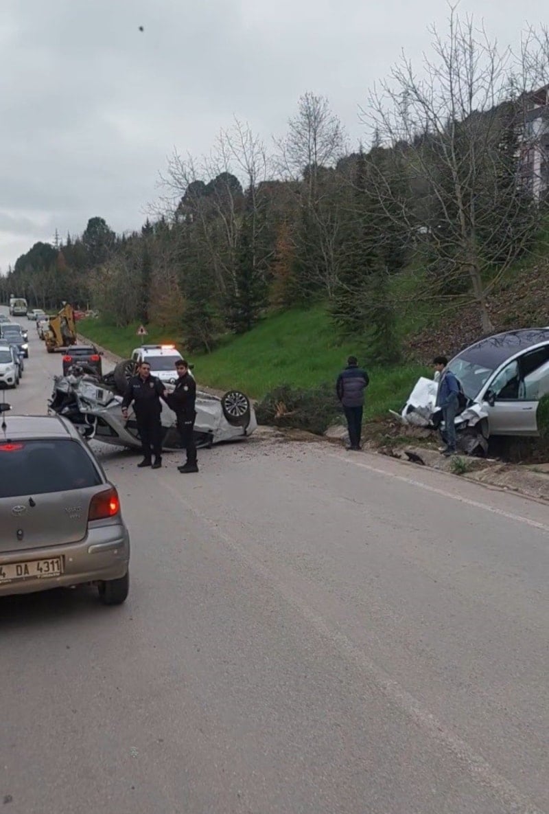 Çarpmanın etkisiyle aynı caddeye sürüklenen park halindeki diğer otomobil de yola devrildi.