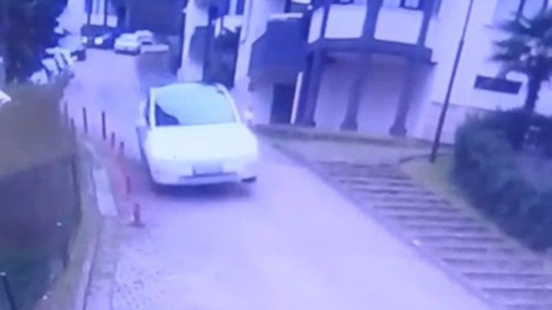 Görüntülerde otomobilin yokuştan hızla inerek demir kapıya çarpması yer alıyor.