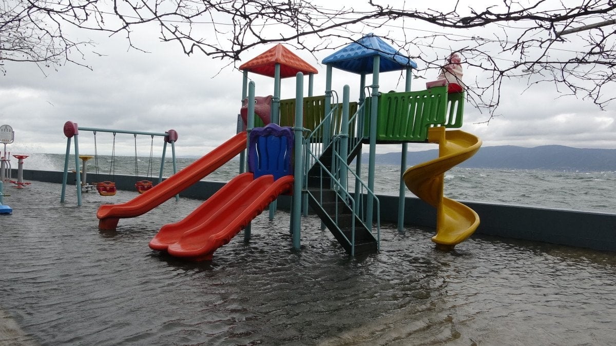 Şiddetli rüzgarın etkisiyle dalgalar yükselirken, deniz taşarak kıyı kesimlerinde su baskınlarına neden oldu.