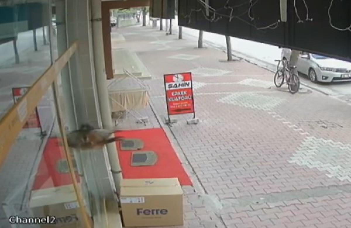 Güvenlik kameralarını kontrol eden iş yeri çalışanı Mehmet Çetin, kamera görüntülerinde kuşun dengesiz bir şekilde süratle gelip iş yerinin camına çarptığını gördü.