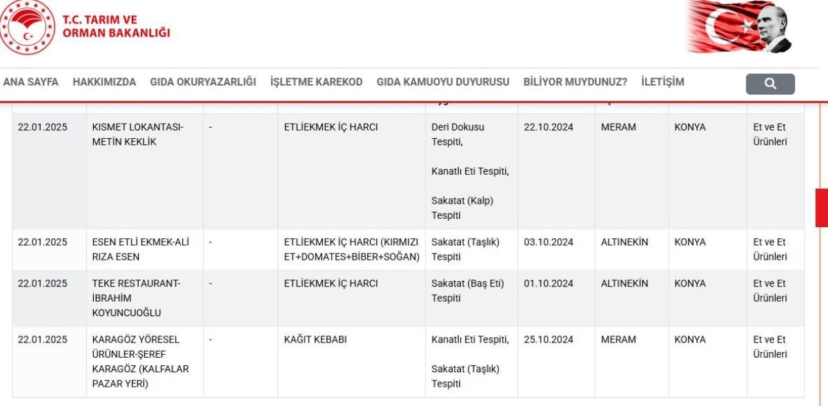 Bakanlığın ifşa ettiği firmalar arasında Kısmet Lokantası, Esen Etliekmek, Teke Restorant ve Karagöz Yöresel Ürünler bulunuyor.