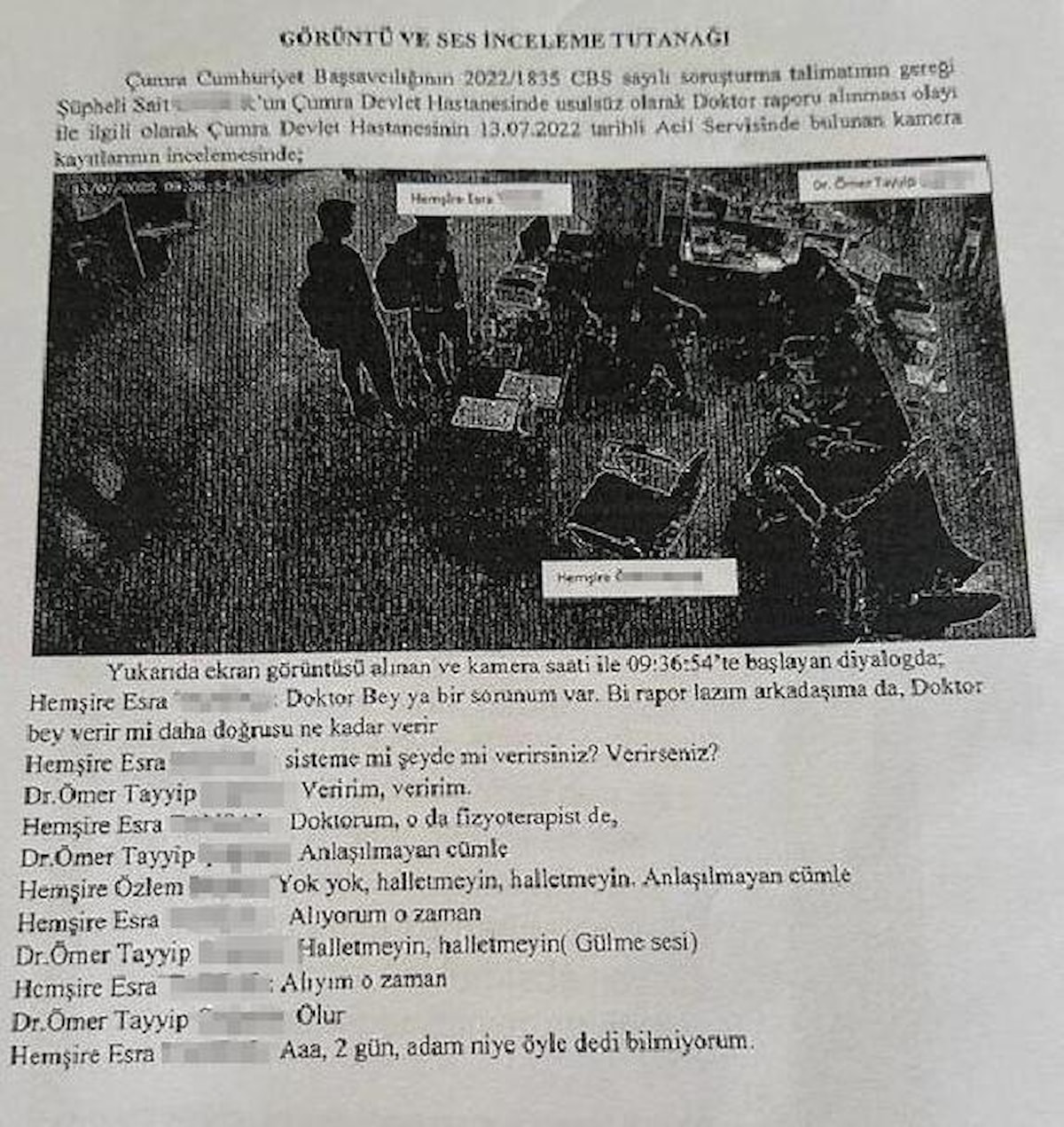 Soruşturma kapsamında hastanedeki görüntü ve sesli güvenlik kamera kayıtları incelendi. Görüntülerde hemşire Esra T.’nin bir arkadaşına raporun lazım olduğunu söylediği, doktor Ömer Tayyip Ç.’nin ise “Veririm olur” dediği tespit edildi.