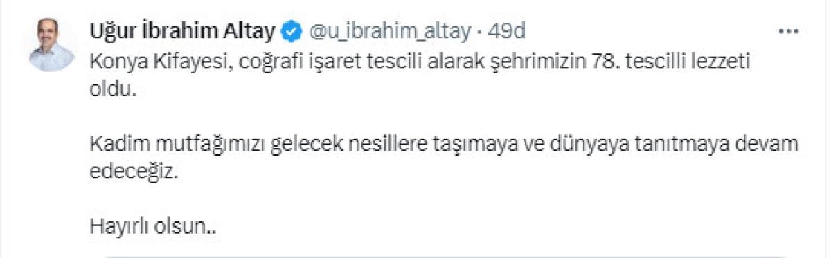 Sosyal medya hesabından Konya Kifayesi'nin coğrafi işaret tescili aldığını duyuran Konya Büyükşehir Belediye Başkanı Uğur İbrahim Altay, "Konya Kifayesi, coğrafi işaret tescili alarak şehrimizin 78. tescilli lezzeti oldu. Kadim mutfağımızı gelecek nesillere taşımaya ve dünyaya tanıtmaya devam edeceğiz. Hayırlı olsun'' ifadelerine yer verdi.