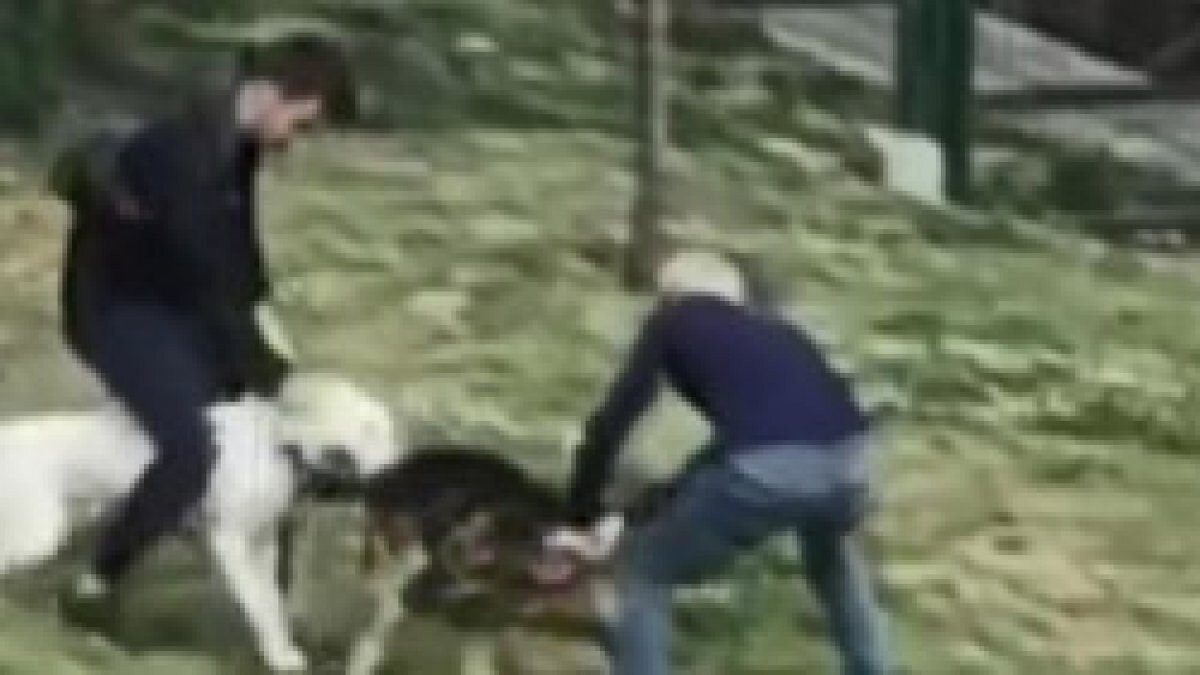 Pitbullun sahibi, sokak köpeğini kurtarmak için kendi hayvanına defalarca yumruk atarken, daha sonra da yerden buldukları sopa yardımı ile yaralanan hayvanı kurtardılar.