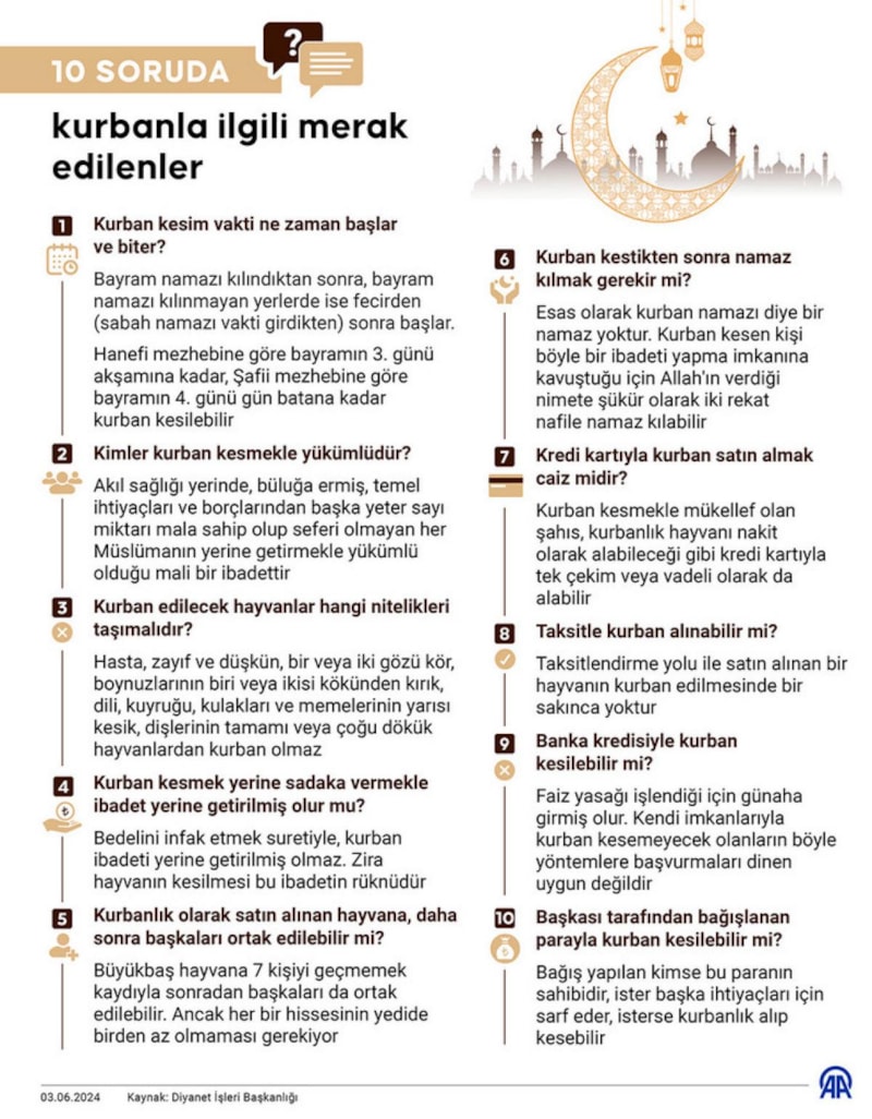AA muhabiri, Diyanet İşleri Başkanlığı Din İşleri Yüksek Kurulundan aldığı bilgilerle, kurbanla ilgili merak edilen konuları 10 soruda derledi.