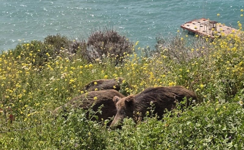 Yiyecek arayan yaban domuzları ve yavruları, Kuşadası’nın Gazibeğendi bölgesinde çöp konteynerlerinin etrafında dolaştı. Uzmanlar, hayvanlara yaklaşmanın tehlikeli olduğunu vurguladı.