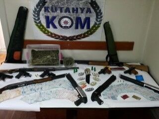 Şüphelilerin adreslerinde yapılan aramada 6 ruhsatsız av tüfeği, 2 ruhsatsız ve 3 kurusıkı tabanca, 9 muşta, 400 gram kubar esrar ve bahisten kazanıldığı değerlendirilen 30 bin lira ele geçirildi.