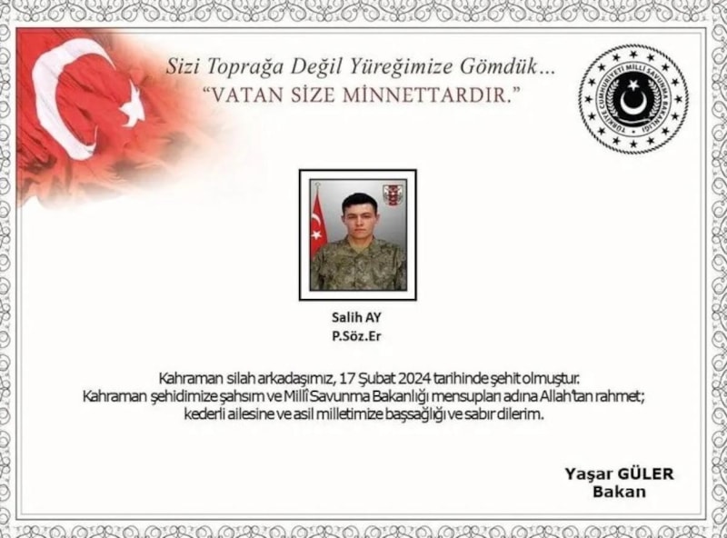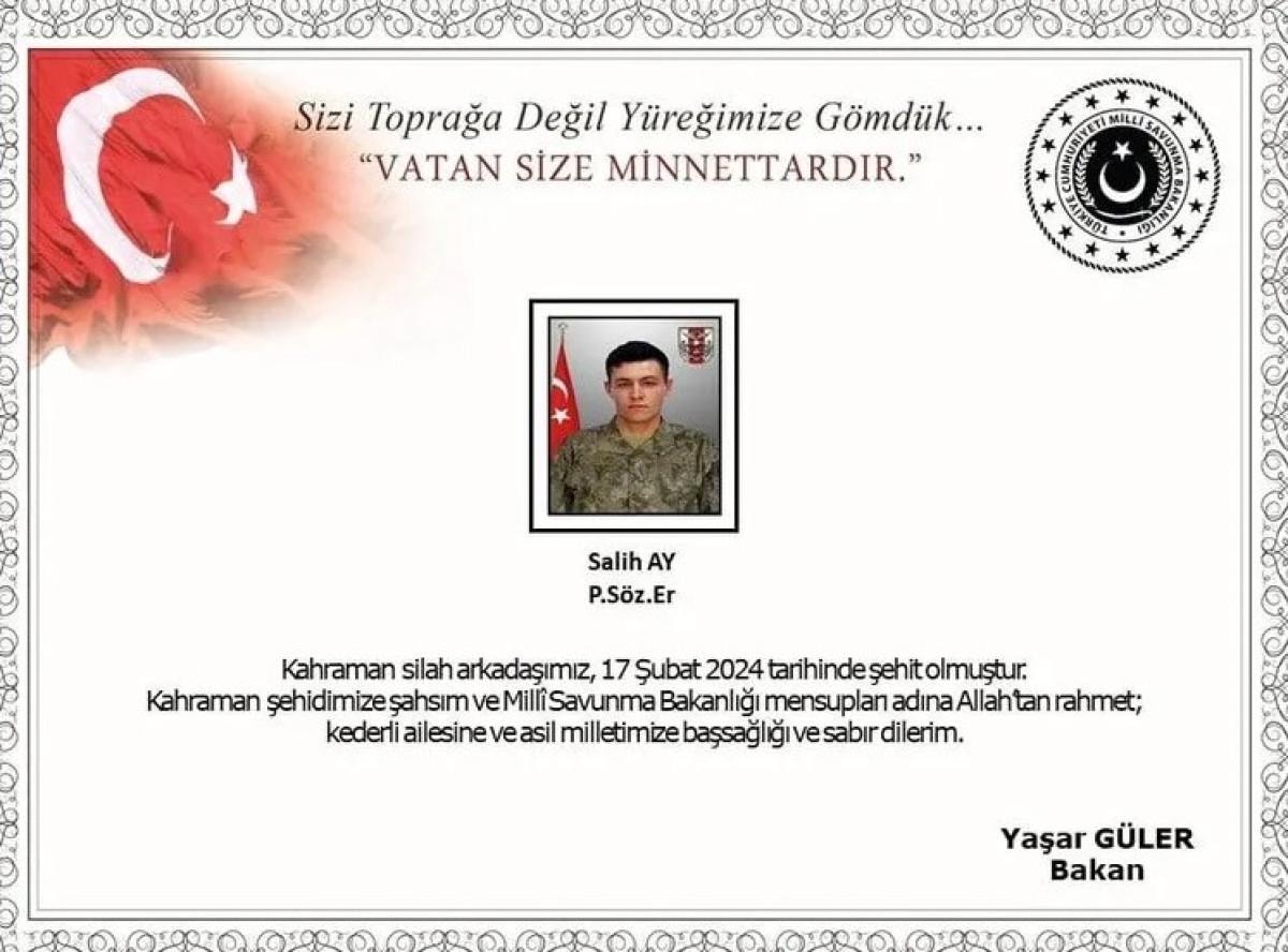 Bugün, yüreğimizi derinden sarsan bir kayıp ile karşı karşıyayız. Piyade Sözleşmeli Er Salih Ay, 17 Şubat 2024’te Kuzey Irak’ta, vatanımızın huzur ve güvenliğini korumak için çıktığı mücadelede, kahramanca mücadele ederken şehit olmuştur. Şehidimize Allah’tan rahmet, kederli ailesine ve milletimize başsağlığı dileriz. Makamı âli, mekanı cennet olsun. Kahramanımızın aziz hatırası, kalplerimizde ve tarih sayfalarımızda daima yaşayacaktır.