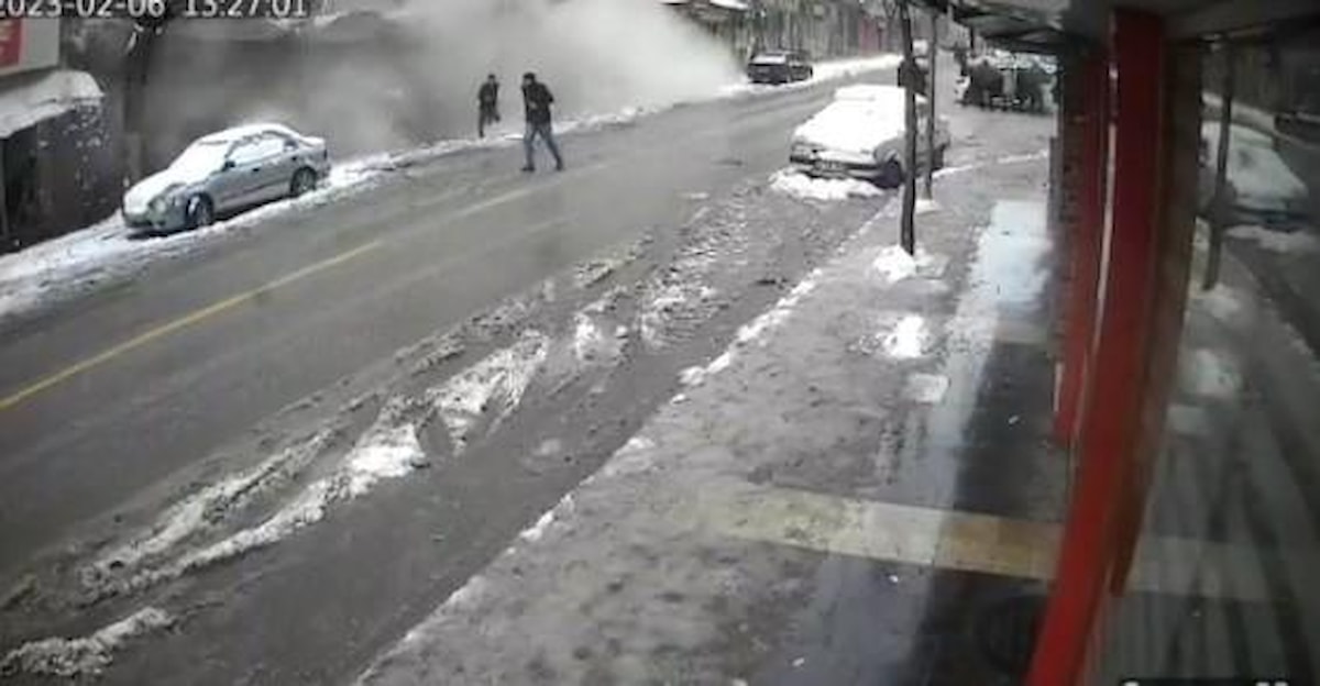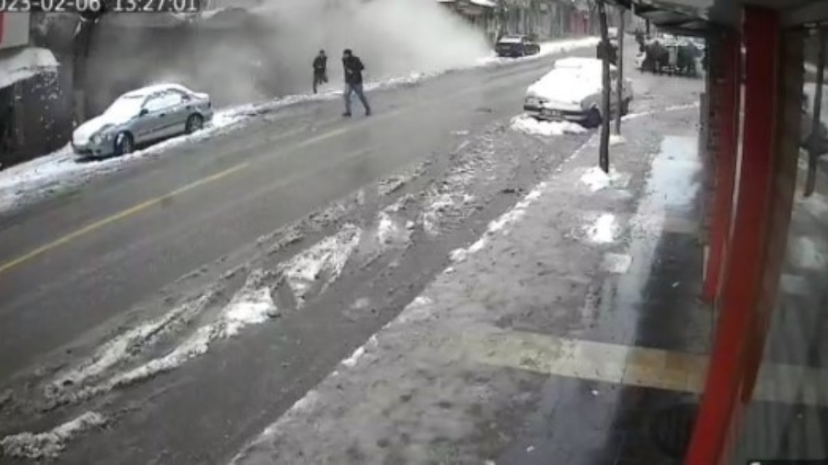Görüntülerde depremle birlikte yoldaki insanların sağa sola kaçışma anlarının ardından biranda ortalığı toz bulutun kapladığı apartmanın ise saniyeler içerisinde yerle bir olduğu görülüyor.