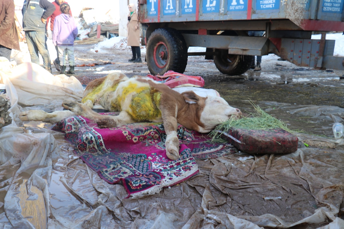 Kısa sürede enkaz alanına gelen veteriner hekim, ilk tedavisini gerçekleştirdiği 5 aylık buzağıyı hayata döndürdü.