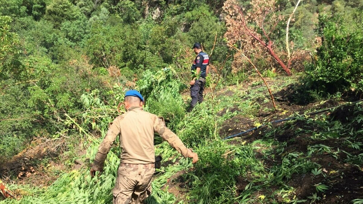 Ormanlık arazide yapılan aramada, 10 bin 350 kök Hint keneviri bitkisi ve 10 kilo kubar esrar ele geçirildi.