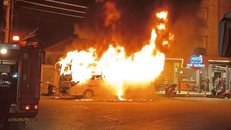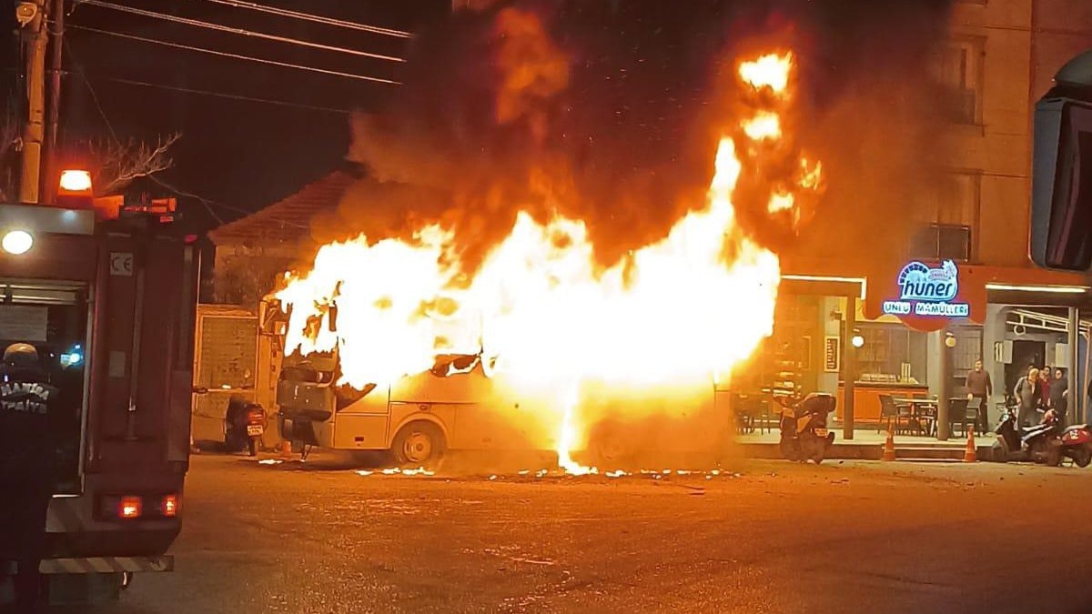 Manisa’nın Turgutlu ilçesinde işçi servisi olarak kullanılan bir otobüs, işçileri almaya gitmek üzereyken alev aldı. Otobüsün boş olması facianın önüne geçerken, yangında çevrede bulunan 4 motosiklet de hasar gördü.