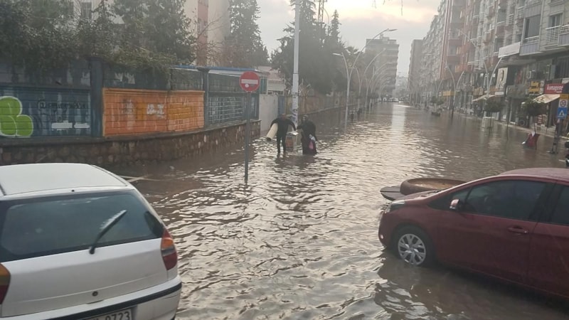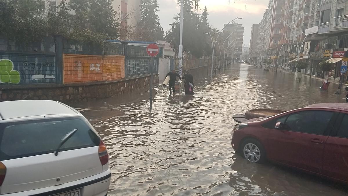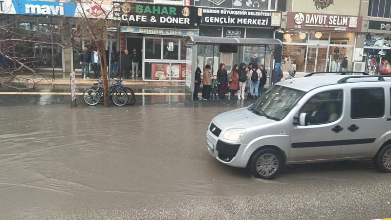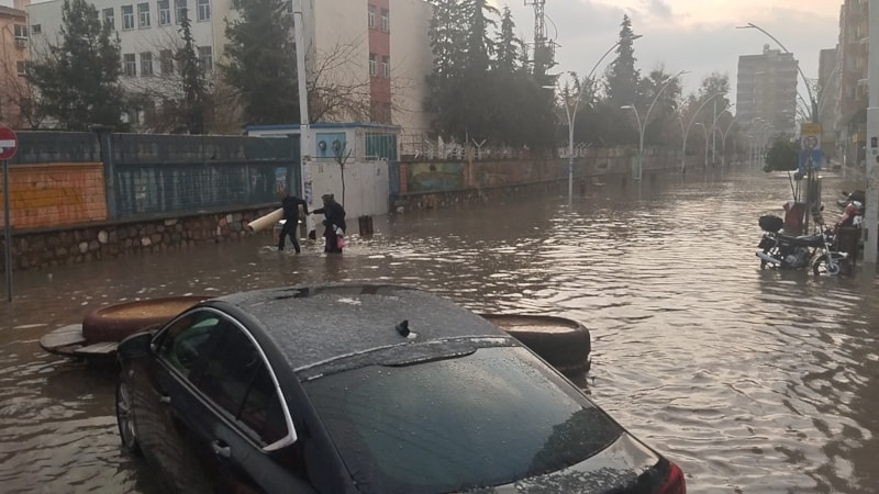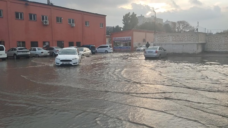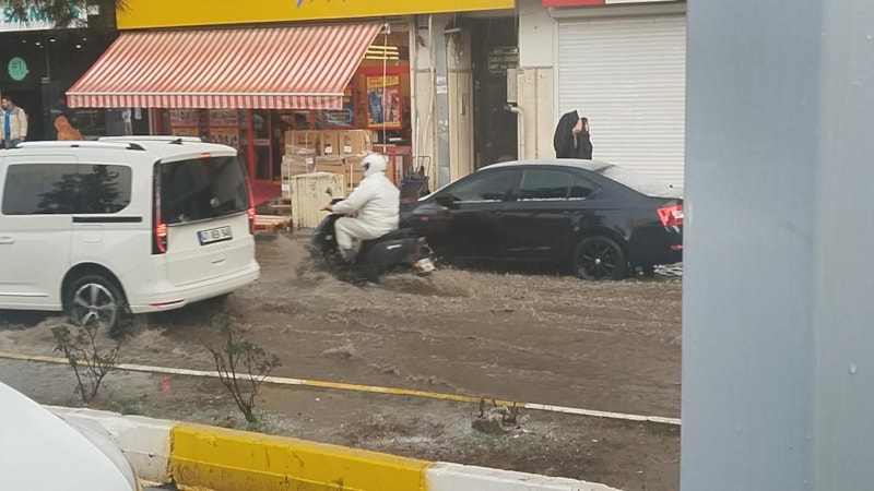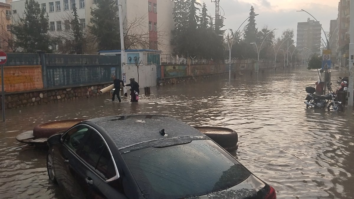 Kızıltepe ilçesinde etkili olan sağanak yağış nedeniyle birçok cadde ve sokak suyla doldu, araçlar ilerlemekte güçlük çekti.