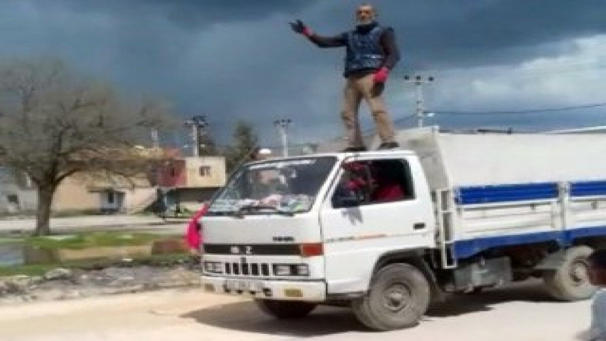 Mardin'in Kızıltepe ilçesinde hurda işi yapan R.K., seyir halinde ilerleyen kamyonetini önce ayaklarıyla kullandı, ardından kamyonetin üzerine çıktı.