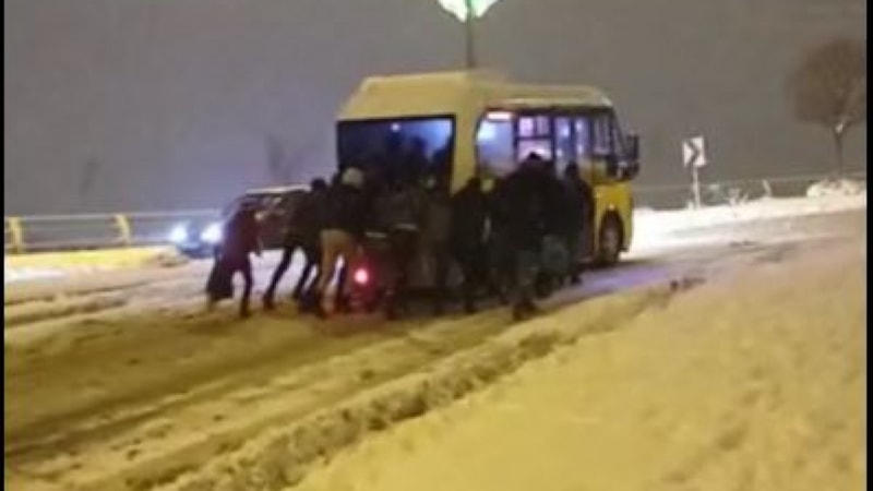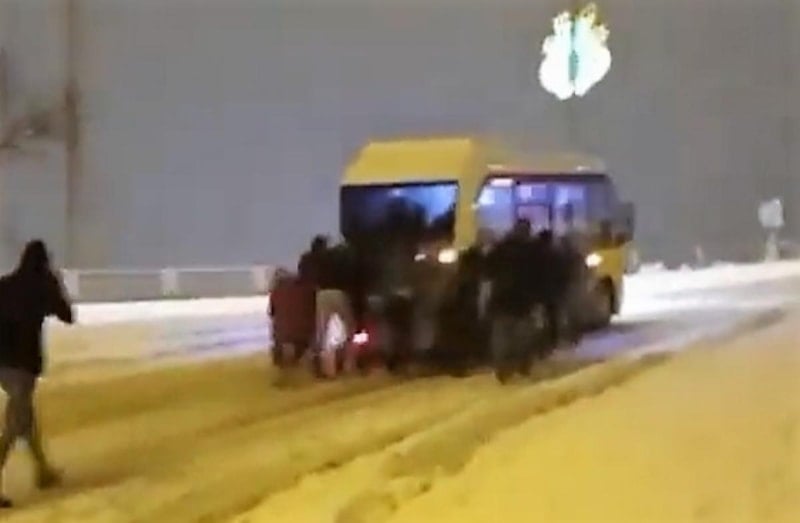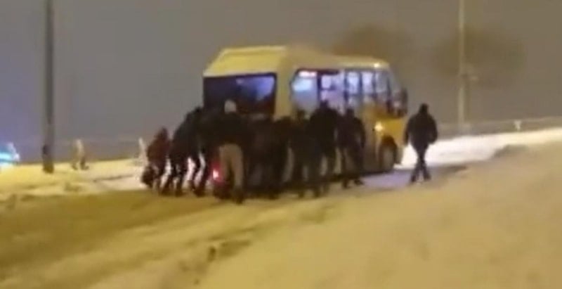 Karda yokuşu çıkamayan şehir içi yolcu minibüsünü, yolcular iterek çıkardı. O anlar başka bir yolcunun cep telefonu kamerasına yansıdı.