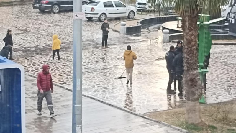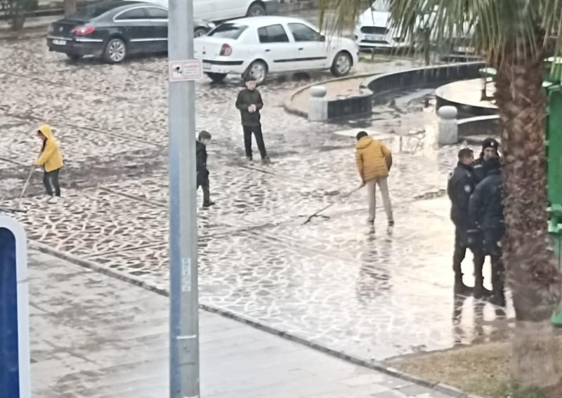Yağmurun kesilmesinin ardından, meydanda top oynamak isteyen çocuklar, çevredeki esnaftan temizlik için çekpaslar alarak su birikintilerini temizlemeye başladı.